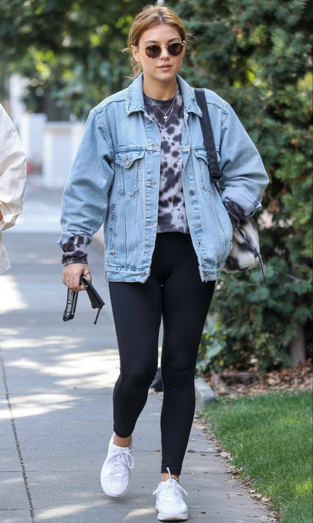 This look is the cozy, off-duty version of cool-girl styling. The oversized denim jacket layered over a tie-dye sweatshirt instantly gives that laid-back aesthetic we all want on busy days. Black leggings and crisp white sneakers keep the outfit streamlined, so even when you’re running errands or heading to the park, you still feel pulled together. The round sunglasses add just the right amount of personality without trying too hard.