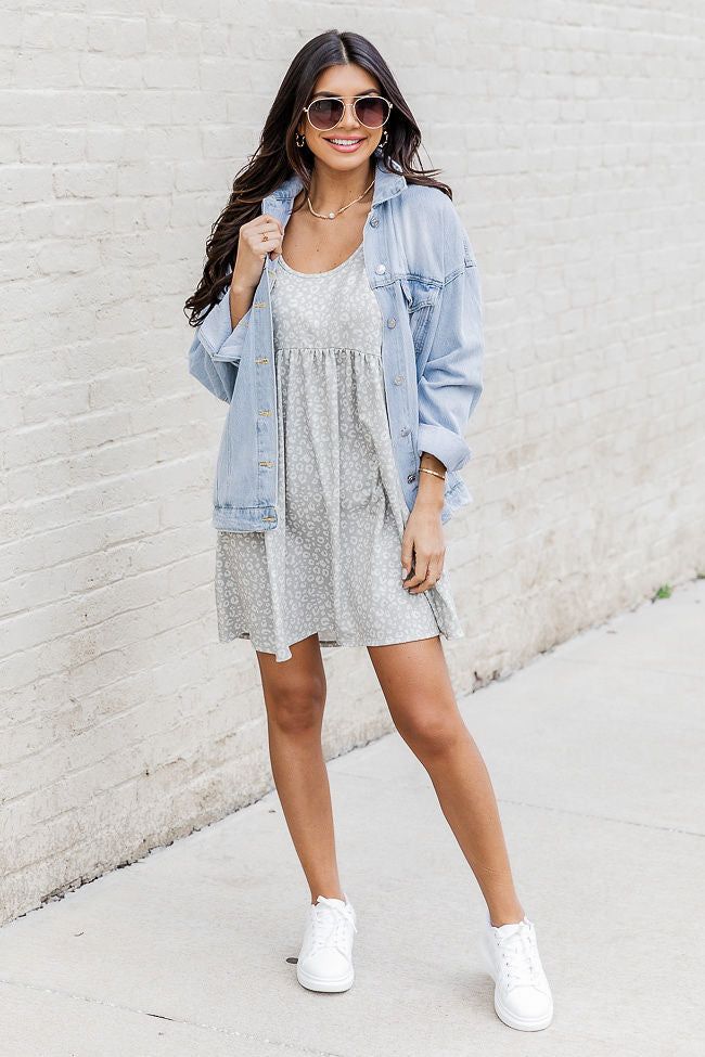 Throwing it back with polka dots and a lightweight denim jacket, this combination is sweet and retro-inspired, showcasing a timeless dress with sneakers appeal. It’s ideal for a spring day or a casual outing, bringing a playful spirit to any event.