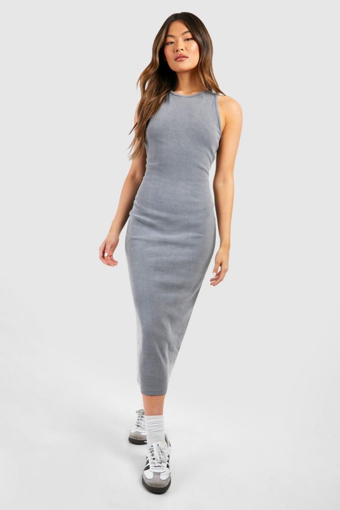 A sleek grey tank dress is the epitome of minimalist chic, serving as a versatile dress with sneakers outfit. The monochromatic look paired with contrasting high-top sneakers creates a casual yet fashion-forward statement ideal for a summer stroll or a casual brunch with friends.
