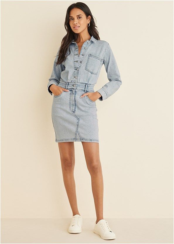 A structured denim dress paired with white sneakers is the ultimate nod to timeless style with a modern edge. The tailored silhouette makes it a great dress with sneakers winter option when layered appropriately.