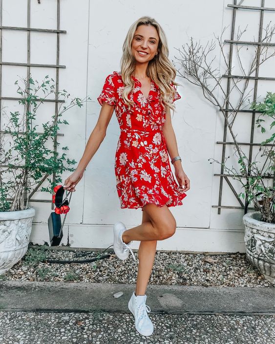 A red floral dress with white sneakers captures the dress with sneakers summer essence. This cheerful ensemble is perfect for daytime outings, encapsulating a casual yet put-together look that’s perfect for summer.