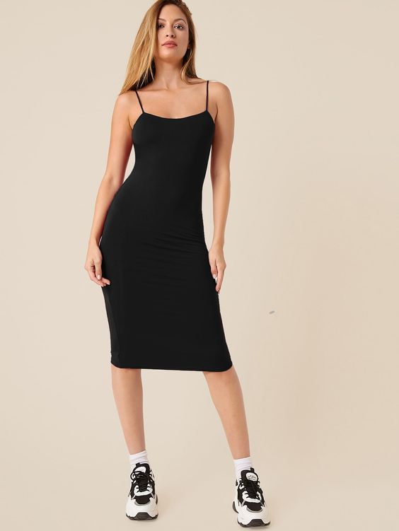 This ribbed black dress with button details adds a touch of elegance to the dress with sneakers trend. The slit not only provides a glimpse of skin but also ensures comfort in movement, perfect for a summer night out. White sneakers keep the look casual and grounded, making it an excellent choice for a dress with sneakers night out.