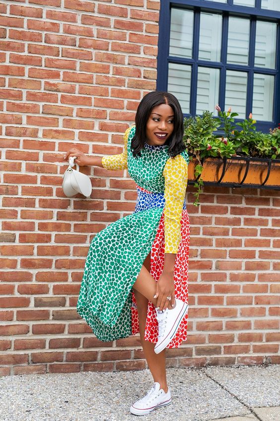 Embrace color and pattern with this vibrant dress that’s all about the dress with sneakers aesthetic. It’s a celebration of self-expression and can be an inspiring dress with sneakers outfit black women can wear to stand out. The low-top sneakers ensure the dress remains the centerpiece.