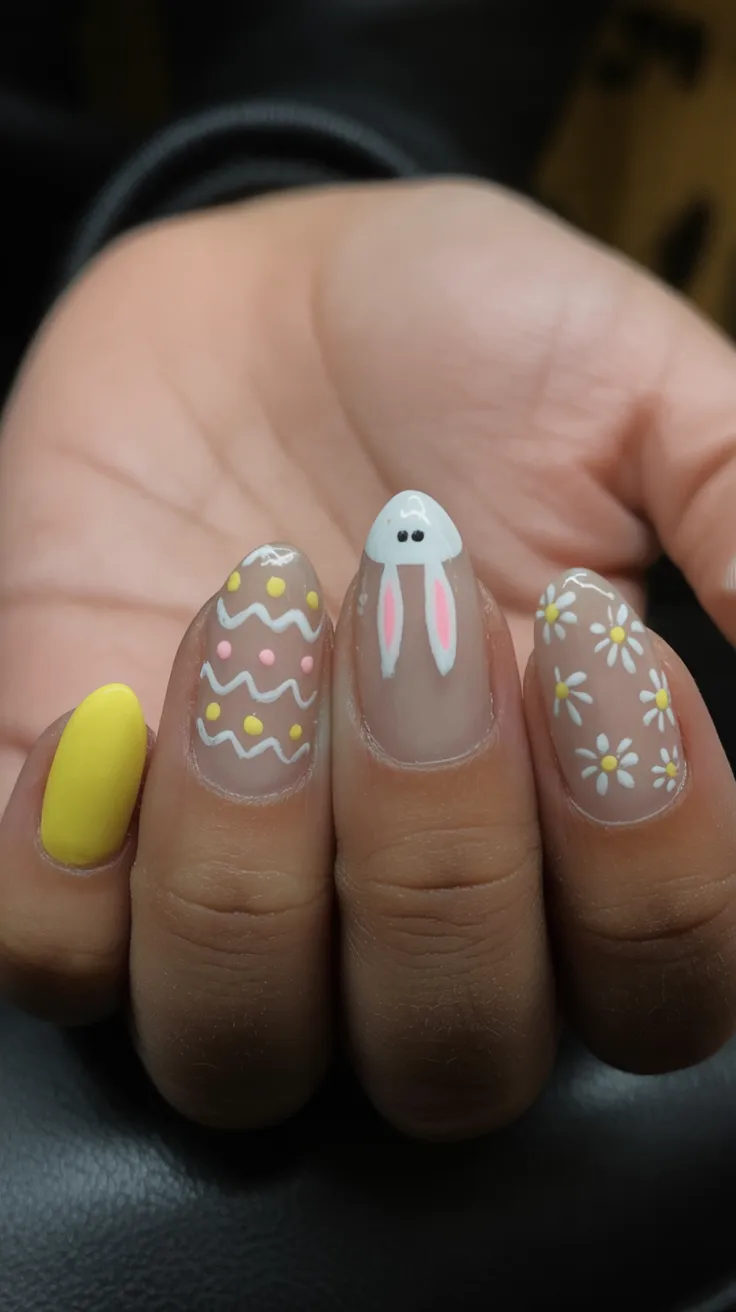 Soft nude bases paired with bright yellow and delicate daisy Art create the prettiest contrast. The bunny detail adds that unmistakable Easter touch, while the zigzag egg pattern keeps it playful.