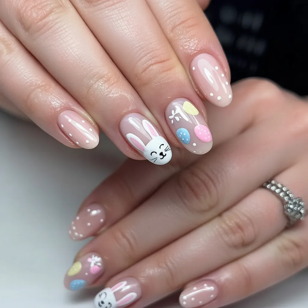 This set feels like a quiet Easter morning before the house wakes up. The sheer blush base with delicate white dots gives that soft, polished glow, while the tiny bunny face and pastel eggs add just enough sweetness. It’s Cute without being loud, and there’s something about that gentle pink that feels effortlessly put together.