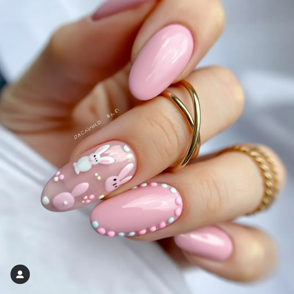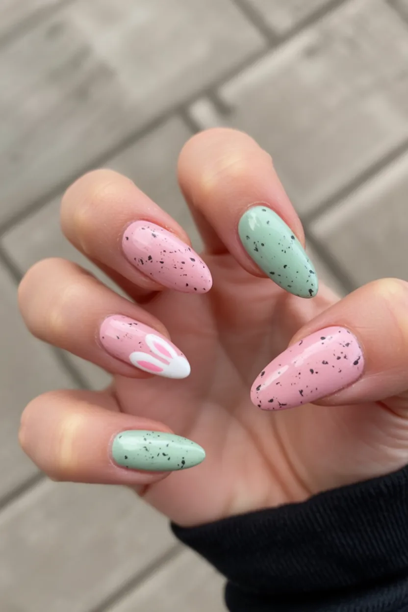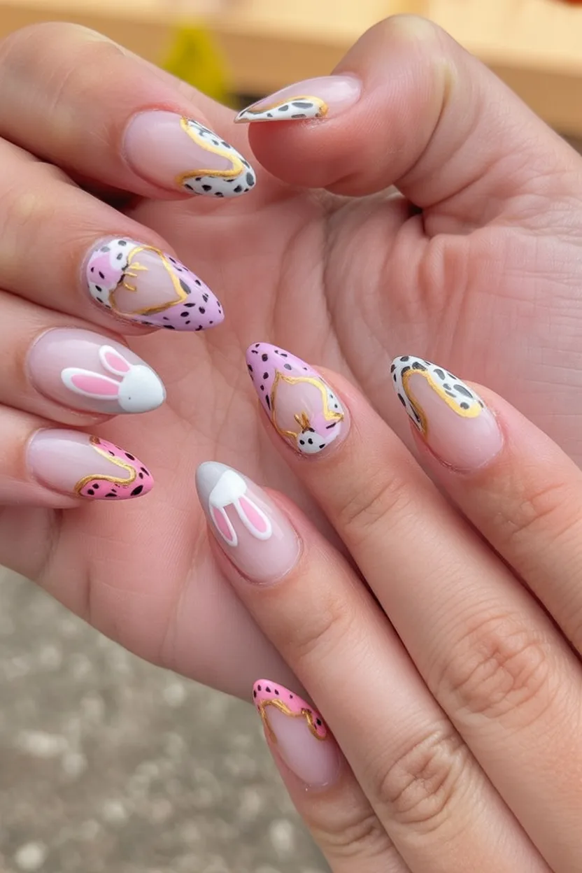 There’s something undeniably feminine about soft pink and lilac wrapped in delicate gold lines. The almond shape alone adds instant grace, but the subtle bunny details and speckles make it feel seasonal and lighthearted. It’s like Easter got dressed up for brunch at a chic café instead of hiding eggs in the backyard.