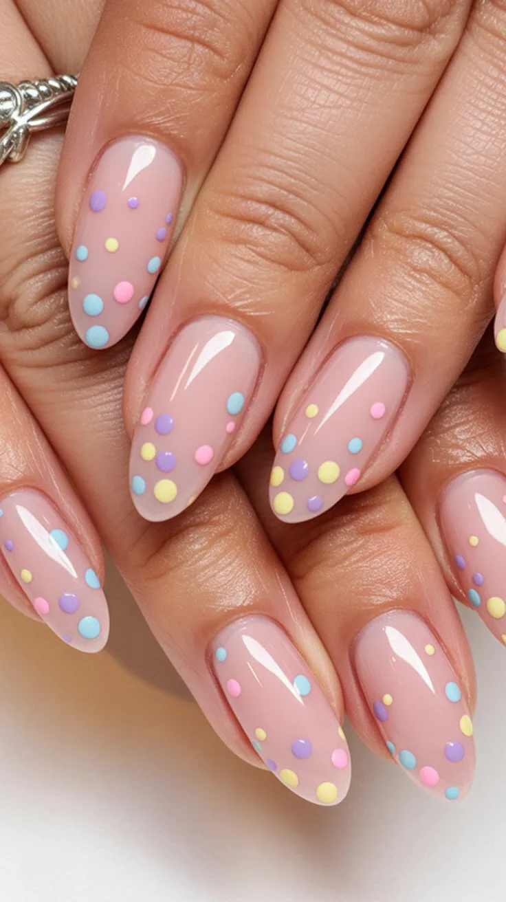 There’s something about colorful polka dots on a soft nude base that feels instantly cheerful. Pink, blue, yellow, and lavender dots scattered across glossy almond nails create a light, airy spring mood.