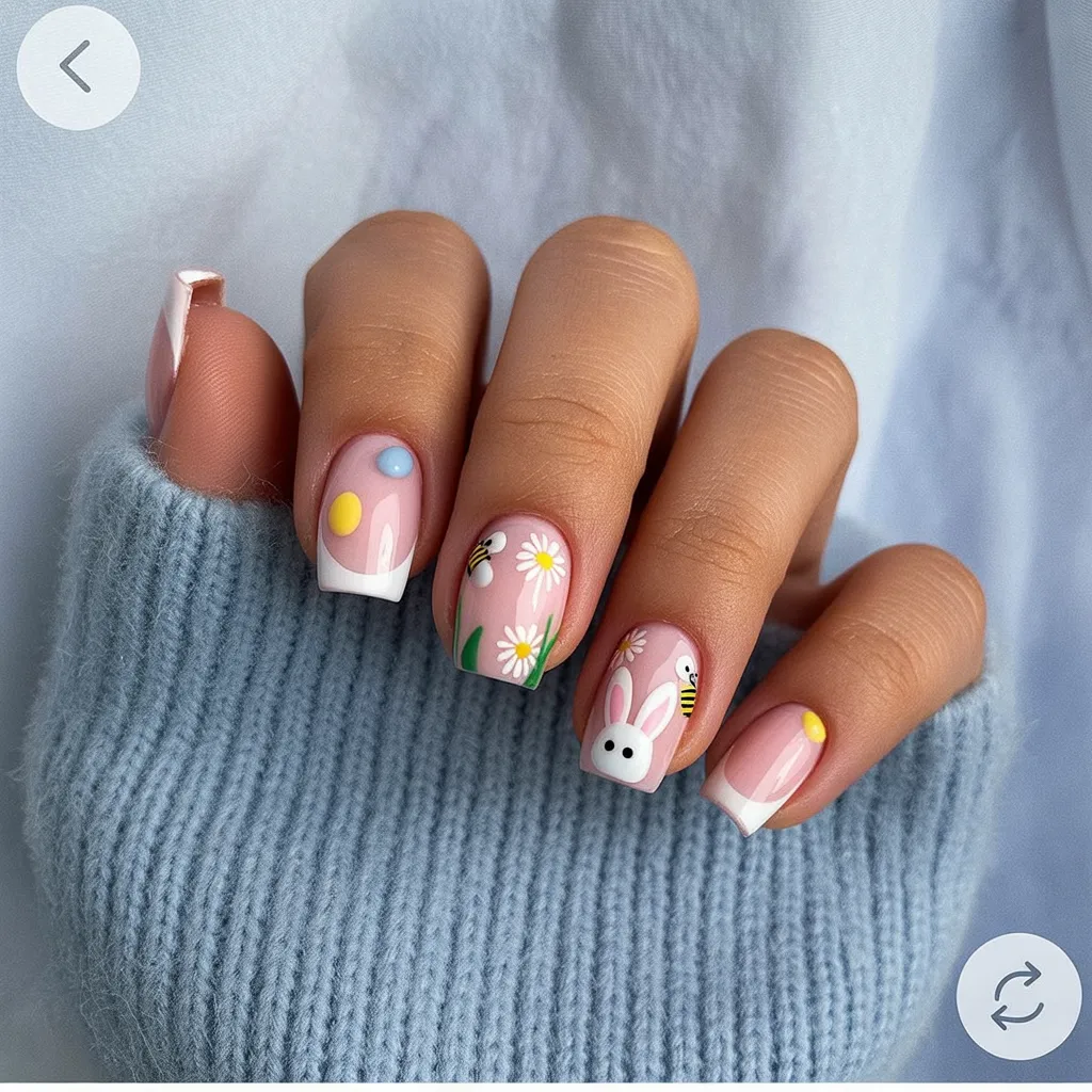 This one is pure storybook Easter. Soft pink bases meet tiny daisies, playful bees, and the sweetest bunny face. It feels whimsical but not childish, like you’ve captured a little garden party right on your nails.