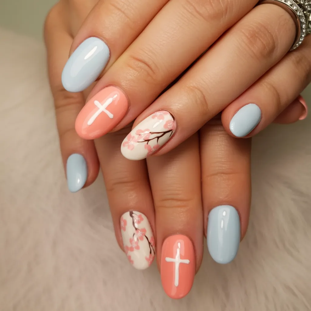 There’s something incredibly calming about this blend of powder blue and warm peach. It feels like early spring skies meeting the first soft blooms on the trees. The delicate floral Art on the accent nails adds a romantic touch, while the subtle cross detail brings a meaningful, understated nod to the season. It’s gentle, elegant, and quietly powerful all at once.