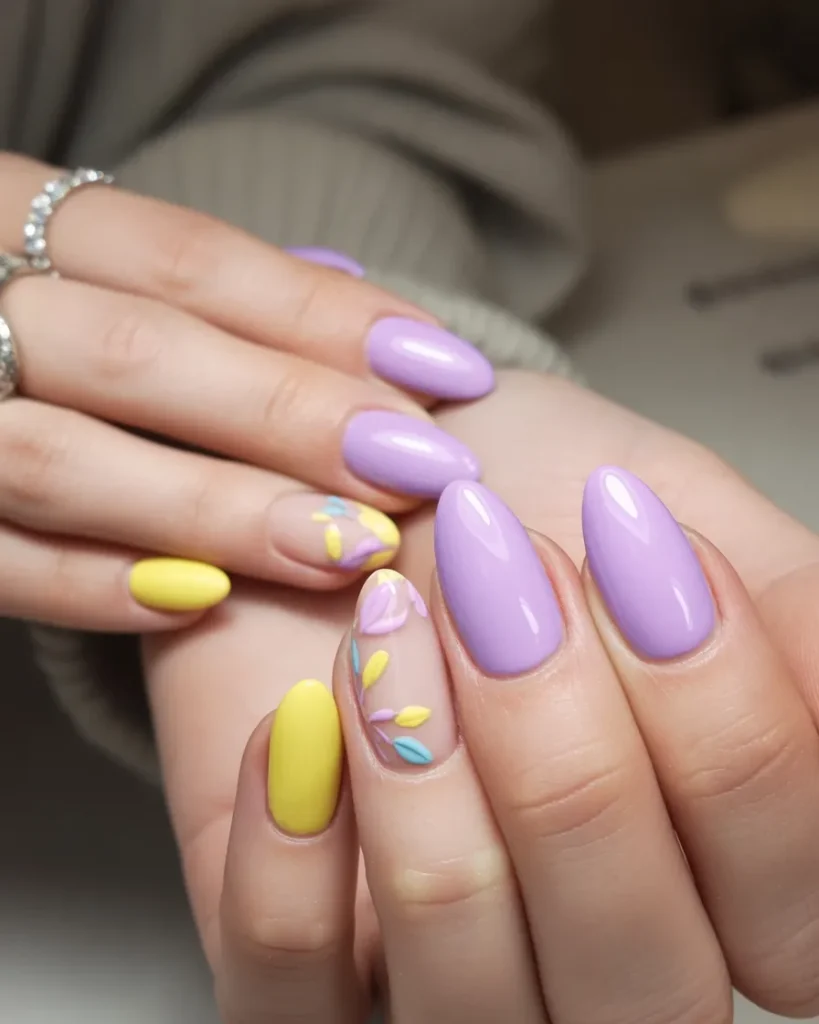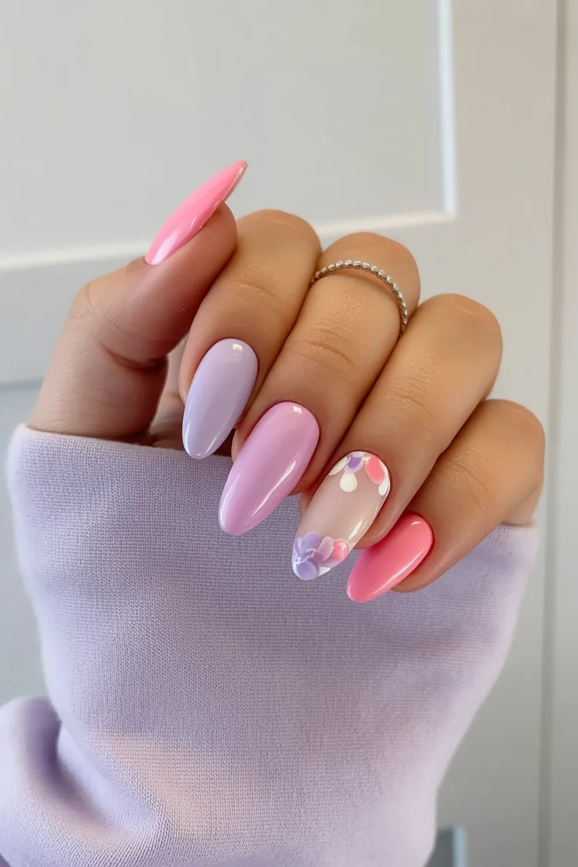 This combination is perfect if you love Pastel Colors but want something a little more dynamic. The almond shape keeps it elegant, and the clean blocks of color make it relatively easy to maintain. For easter spring nails 2026, this color pairing is a fresh standout.