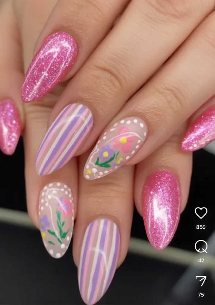 There’s something so fresh about mixing stripes with florals. The pink glitter adds that festive Easter glow, while the soft floral Art keeps it grounded in spring romance. It feels creative and expressive, like you’re wearing a tiny canvas on each finger.