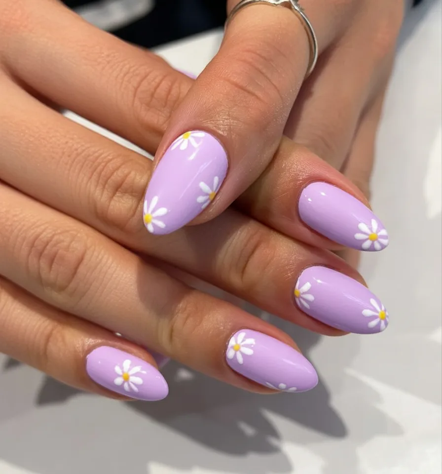 Lavender just has that calming, happy energy, doesn’t it? Add tiny white daisies, and suddenly your nails look like a miniature spring field. The glossy finish keeps it clean and bright, while the floral Art gives it that lighthearted Easter charm.