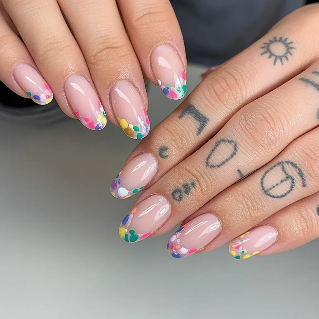 This design feels like Easter candy sprinkled right onto your tips. The soft nude base keeps everything elegant, while the colorful confetti edging adds movement and personality.