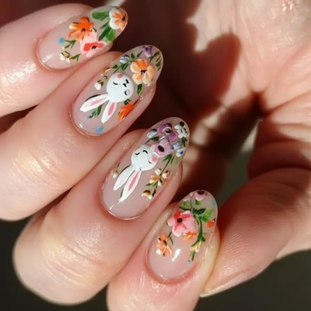 This set feels like a miniature spring meadow wrapped around your fingertips. Soft neutral base, delicate florals, and peaceful little bunny faces—it’s romantic without being overly sweet. There’s a calm elegance here that feels grown-up and artistic.