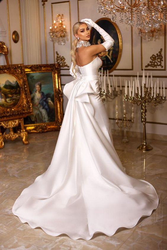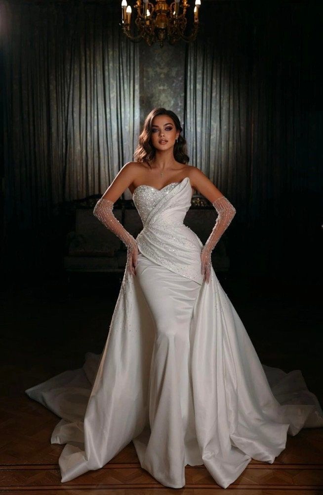 Embrace the avant-garde with this dress, where elegance meets innovation. The gown’s form-fitting silhouette and sweetheart neckline combine classic bridal aesthetics with cutting-edge design. Dramatic detachable panels extend from the waist, creating a modern-day train fit for a walk down the aisle or a grand entrance. This piece is the epitome of ethereal wedding dress goddesses—a true masterpiece for the bride who desires to stand out on her wedding day. With its clean lines and flowy accents, it’s perfect for the bride seeking a ethereal wedding dress long sleeve option that can transition to a sleeveless look.