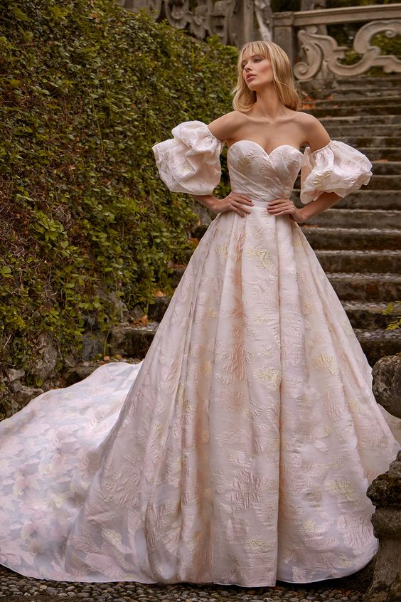 For the free-spirited bride, this ethereal wedding dress romantic boho option is sheer perfection. The dress boasts a playful yet elegant design with its flowing layers and gentle puff sleeves. The natural setting complements its whimsical nature, making it ideal for an outdoor or forest-themed wedding.