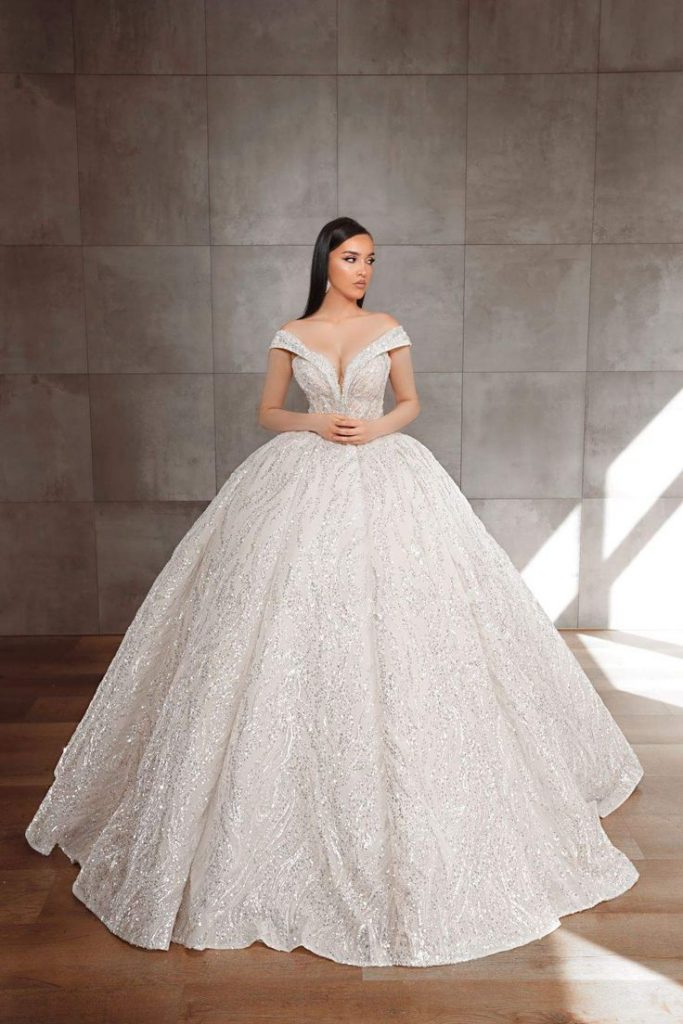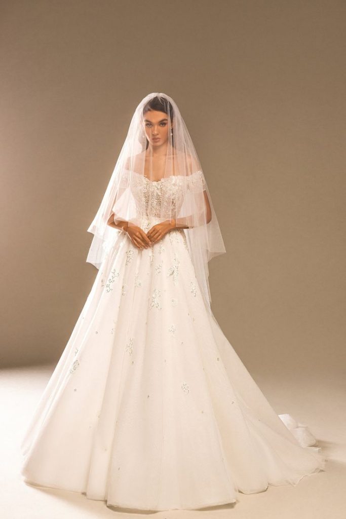 Drama unfolds with this striking ethereal wedding dress that combines a deep off-shoulder neckline with a sweeping skirt. It’s a gown fit for a dramatic entrance, leaving an impression of timeless beauty.