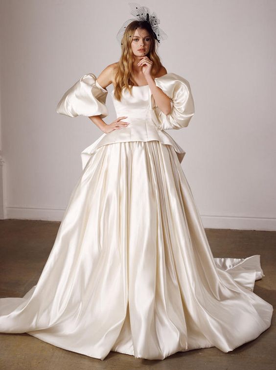 A gown that could have been crafted by the hands of ethereal wedding dress goddesses, this piece is an ode to the contemporary deity. It features a fitted bodice with a sheer overlay, adorned with subtle embellishments, and a voluminous skirt that adds an air of mystery and grace.