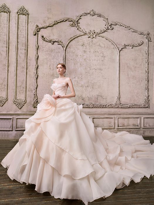 Enveloped in the opulence of Baroque romance, this gown offers layers upon layers of sumptuous ruffles, creating a silhouette that is both grandiose and airy. The strapless bodice features delicate folds that add texture and depth, presenting an ideal vision for ethereal wedding dress romantic seekers. This dress is a testament to craftsmanship, where every ruffle seems to dance with the promise of timeless love.