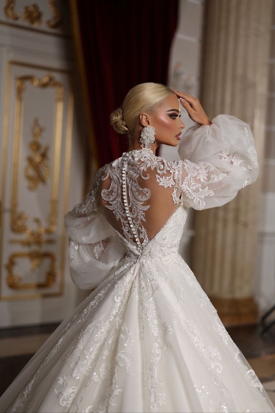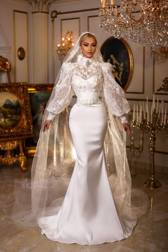Majestic and empowering, this dress exudes regality. The form-fitting mermaid silhouette, coupled with the delicate lace detailing and long, sheer sleeves, creates a ethereal wedding dress long sleeve that is both captivating and stately.