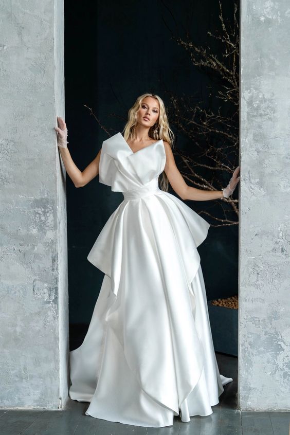 Striking in its simplicity, this gown is a testament to modern minimalism in bridal fashion. The bold neckline and structured skirt present a ethereal wedding dress plus size option that highlights confidence and chic elegance.