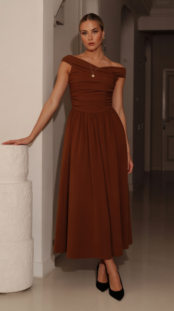 7. Elegant Off-the-Shoulder Brown Midi