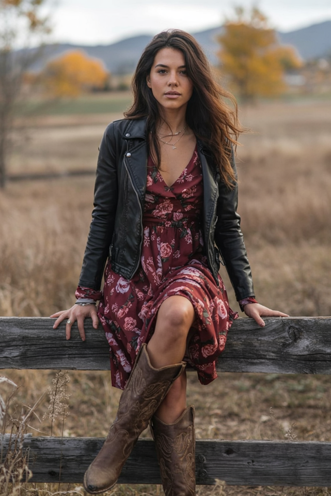 There’s a beautiful balance of soft and tough here — a flowy floral dress topped with a sharp leather jacket and classic cowboy boots. It feels effortlessly cool, the kind of outfit that turns heads at any fall festival. Feminine with just enough edge, this is an idea for those who love mixing styles.