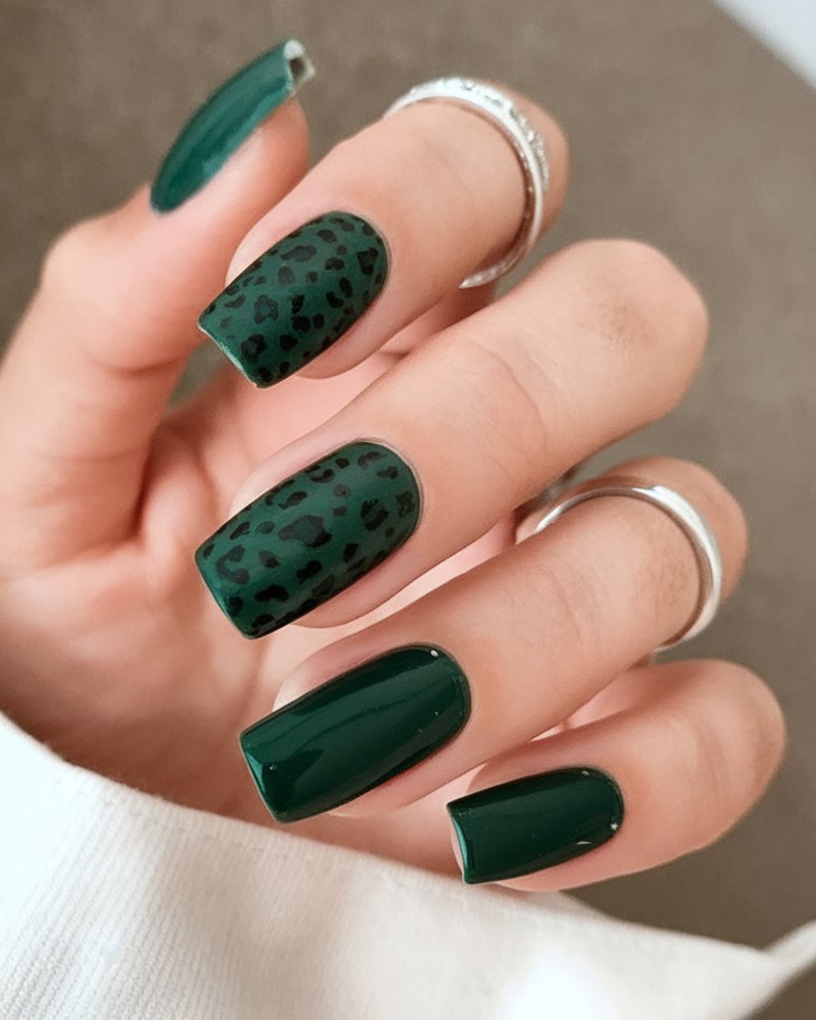 This appearance is sort of an autumn stroll in the woods, it is sumptuous, daring, and somehow wild. The thick green lacquer is bold with no apologies on its side but the matte leopard decorations on two fingers require no additional efforts too hard, on the contrary. It’s sultry but not flashy, earthy yet glamorous.
