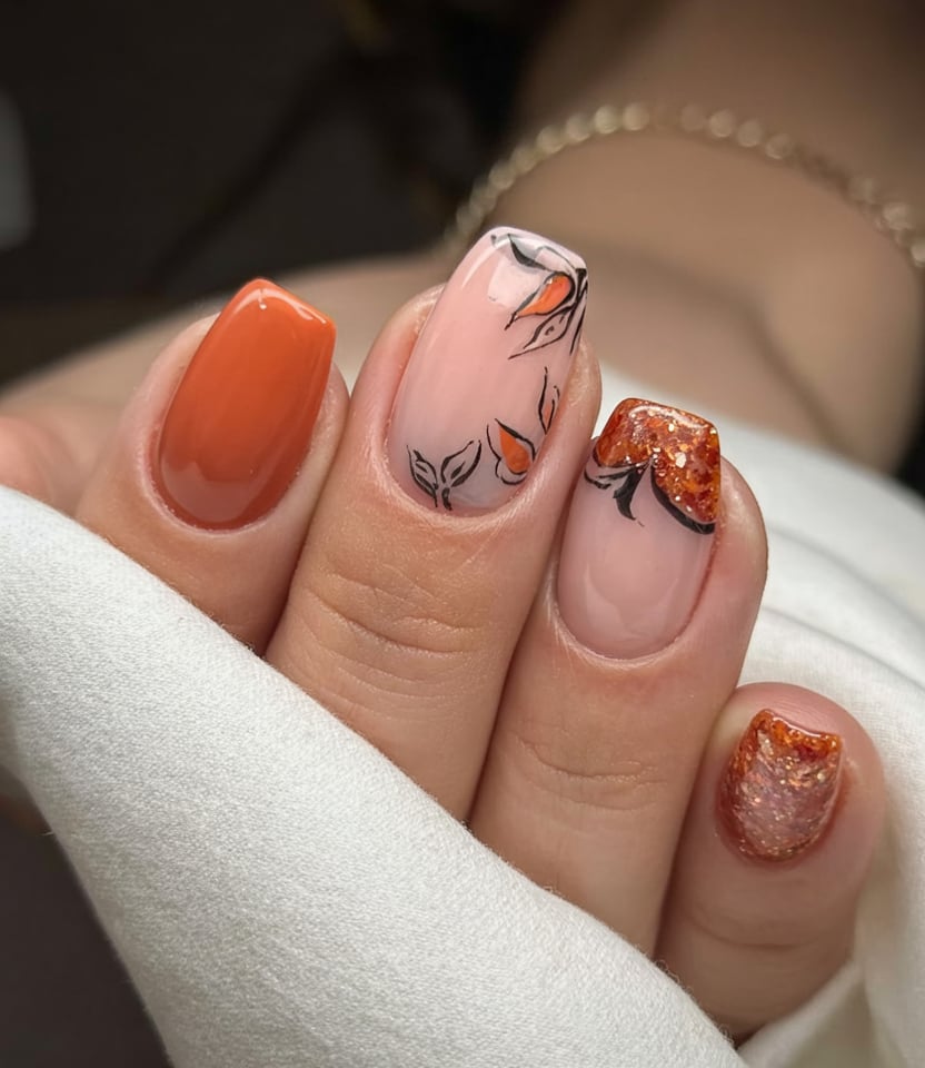 This ideas autumn manicure fits medium length of a mixture square or coffin and it can be done on a set of acrylic nails and natural nails. It is perfect for people who enjoy flashy seasonal colors but do not want to overdo them as it is bright with an elegant twist.