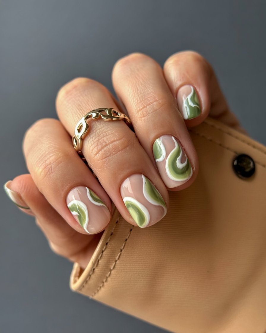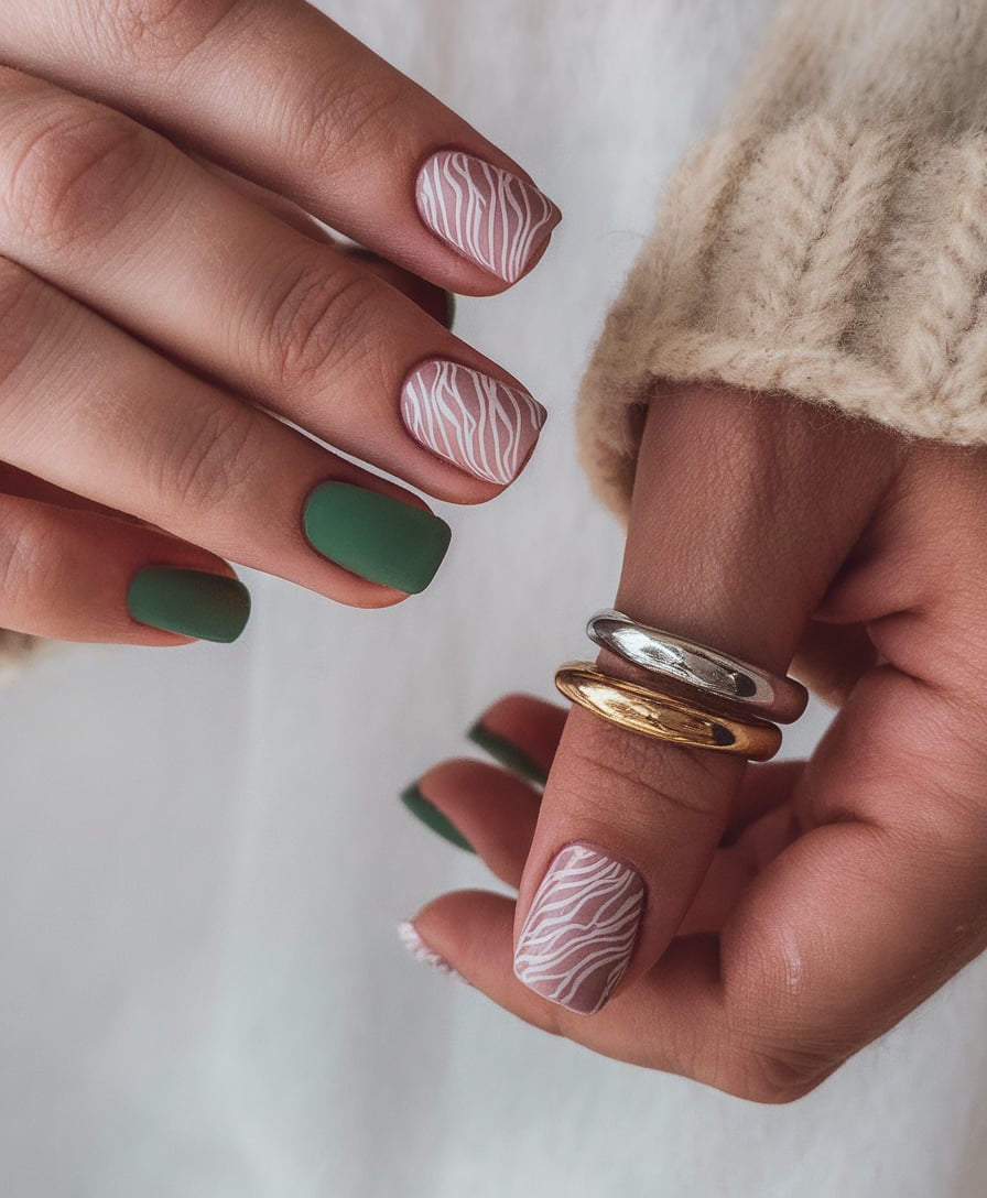 The blend is like a cozy sweater and a cup of chai on a fresh autumn morning. The matte green nails provide a more down-to-earth, humble foundation, and the blush nails featuring soft zebra-like zig-zag lines give the unexpected artsy je ne sais quoi. It is a glimpsed look of you being on the side of people who love the details of life, but you are never a fastidious person.