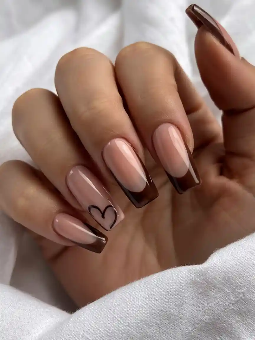 Warm coffee, leather boots and emotional text messages do not have a nail version–this is it. The simple black heart motif in contrast with the brown and nude base gives an adorable dimension to the brittle French details.