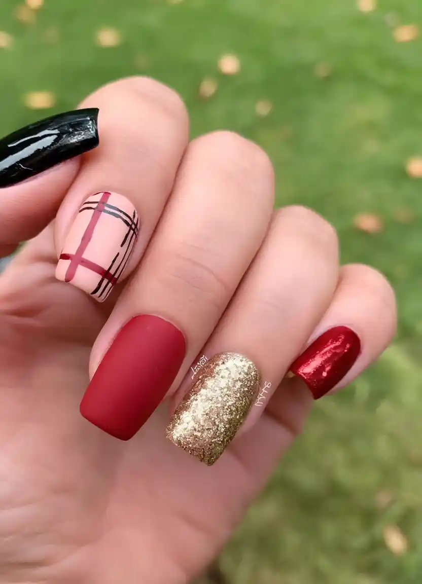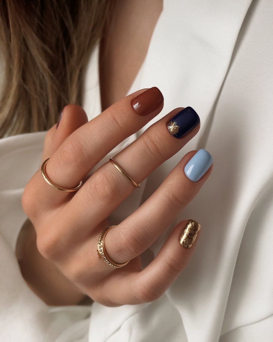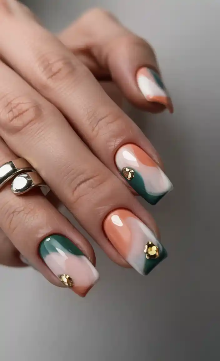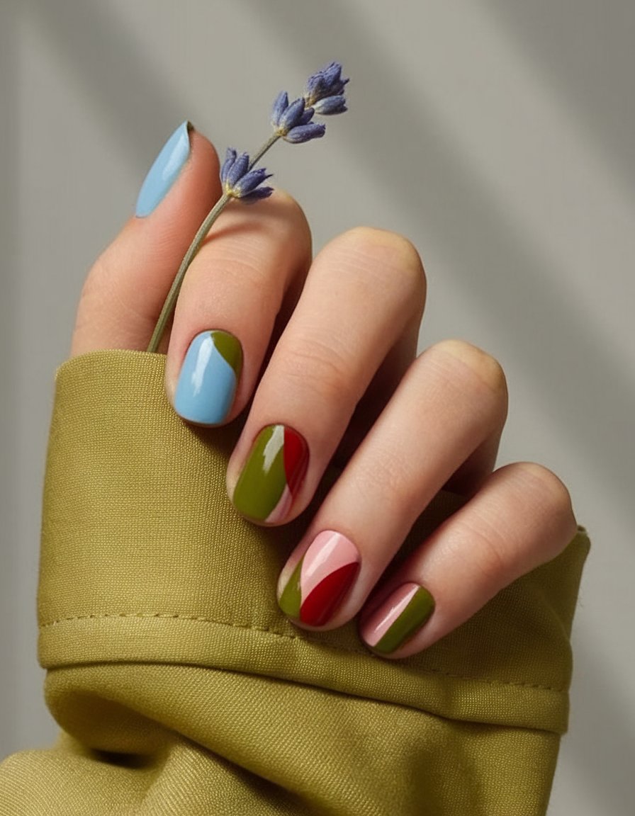 Sky blue with moss green, cherry red and soft blush pink, this fun mashup is an artistic interpretation of fall nails square 2025. It is like gallery walls and cappuccino mornings it is very stylish but not arrogant, daring and not too loud.