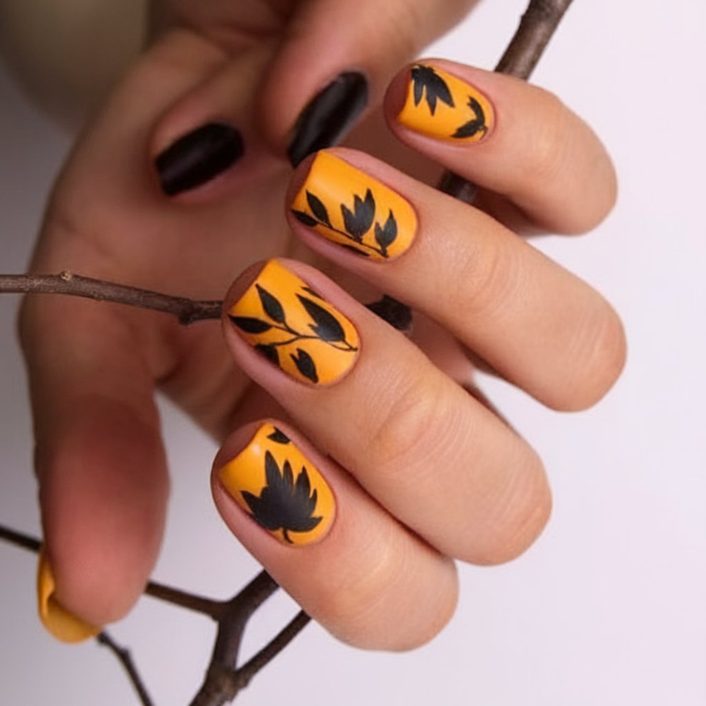 It seems like it is golden hour in the afternoon of October in this manicure. The background of matte mustard brings the black outline of the leaves into focus and provides central concept autumn inspiration through boho influence.