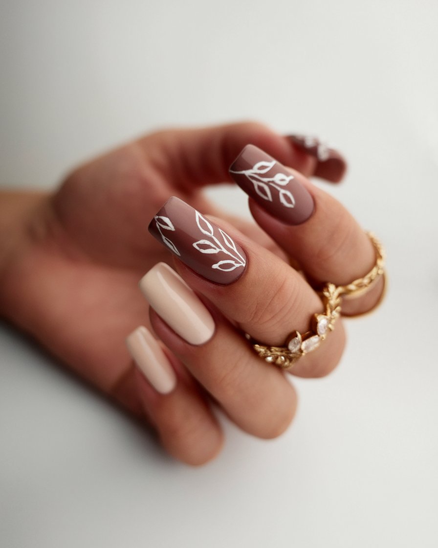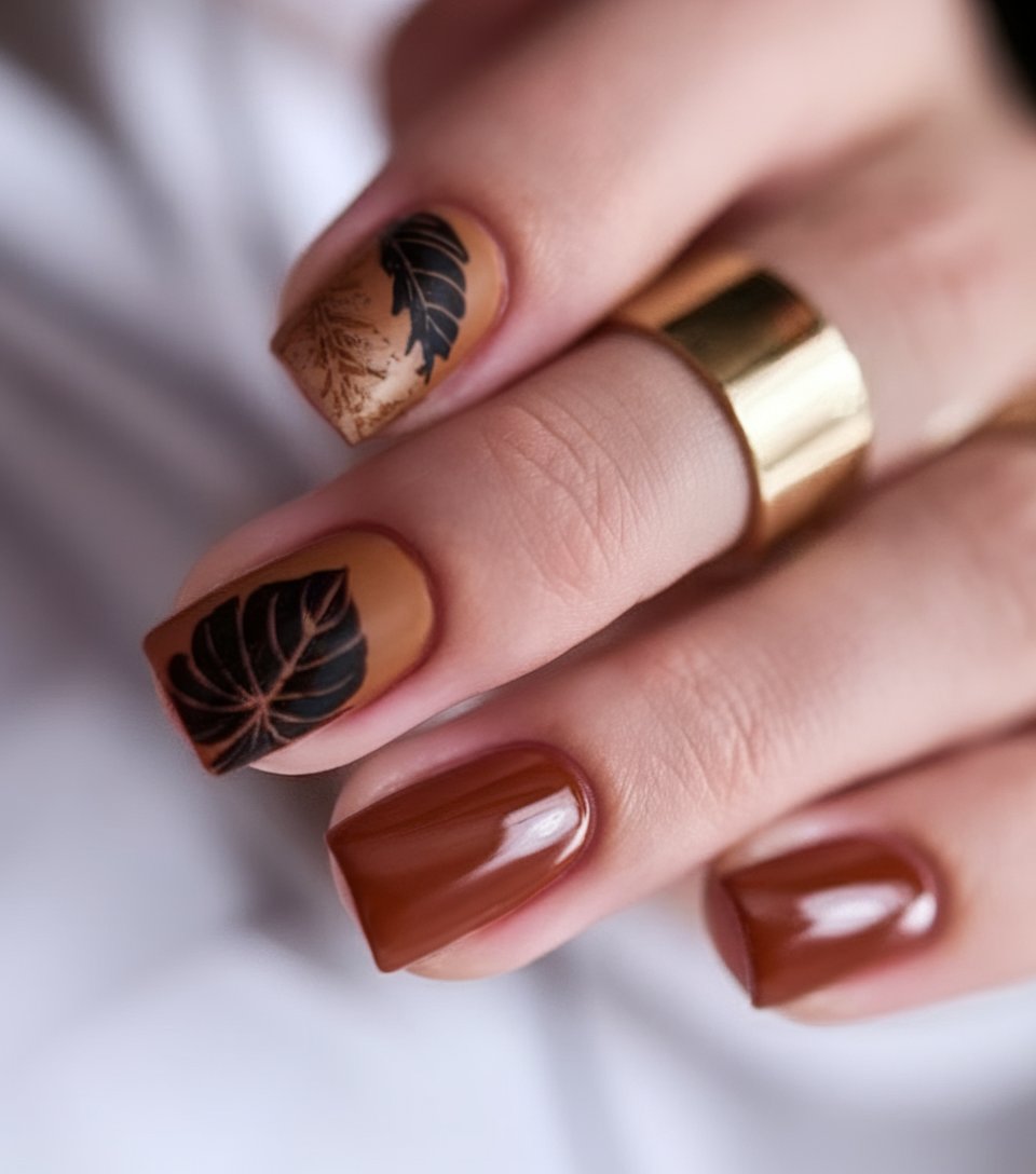 Rich chocolate tones with leafy sketches? Yes, please. All the slick vibes of your favourite cafe are gathered in this one passive idea of moody fall on your nails.