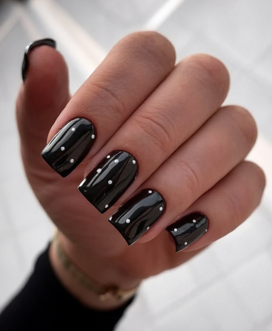 It is a new take on the iconic black mani that is moody but fun. The sequence of the little white dots is only enough to make it outstanding without overriding the vibe. Treat it like a dark night sky with stars in it, mysterious yet sparkling in beauty.
