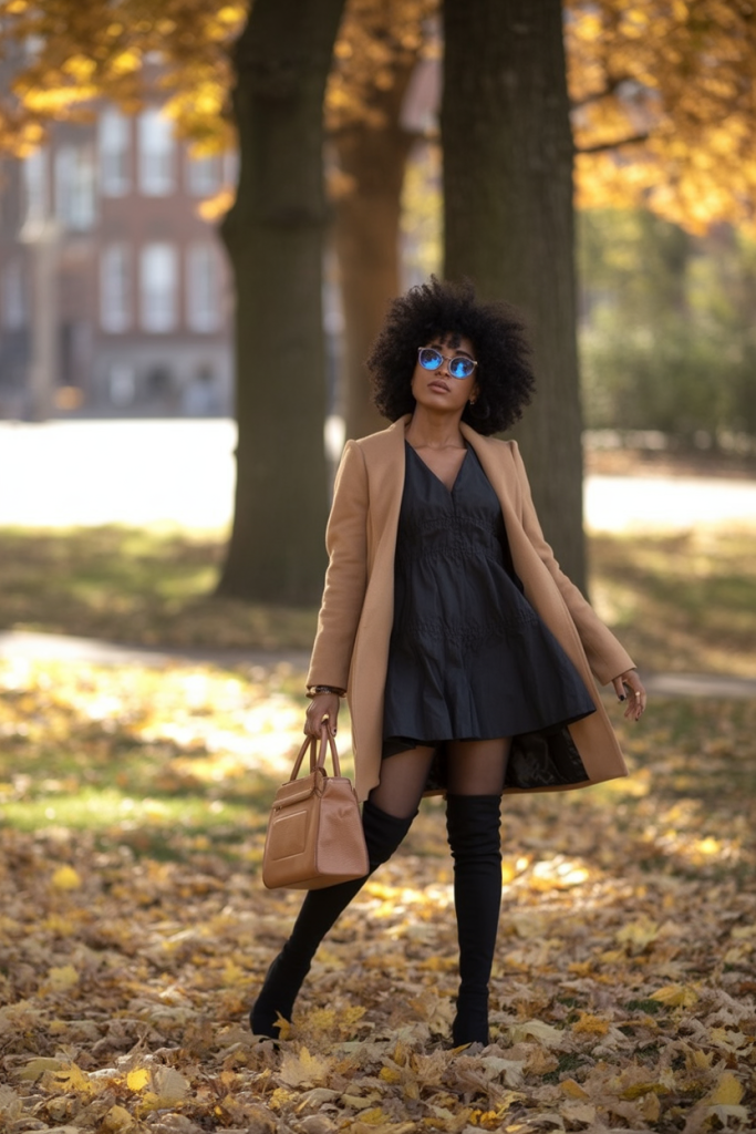 There is even something so brazen about wearing a flirty black mini dress with a soft camel coat and thigh-high boots. This ensemble reminds of casual chic with a pinch of bad girl vibes, that will suit nicely on a fall walk or a urban brunch. Add the blue-tinted tones and a firm body bag and you are in the era of your main characters- no apologies just assurance.
