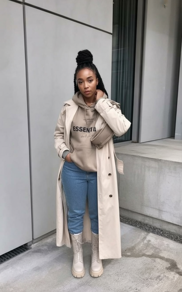Sometimes, cozy wins the day—and this outfit proves it. The balance between effort and ease consists of a trench that is covering a hoodie and light-washed jeans. And pair with cream combat boots and a neutral crossbody and you will be a low-key off-duty model.