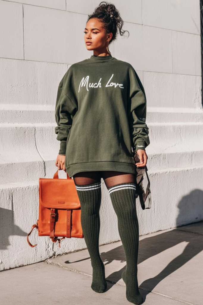 This would be the uniform of fall, baddie meets back-to-school queen. The XXL sweatshirt and the thigh-high socks will provide you the urban gear cockiness and the orange leather backpack will add some flavor to put some extra personality into play.