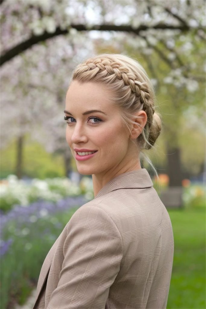 This crowned French braid updo is a dreamy choice for formal occasions like weddings, galas, or parties. The style intertwines intricate braids with soft twists, creating a regal effect that’s perfect for both medium and long hair.