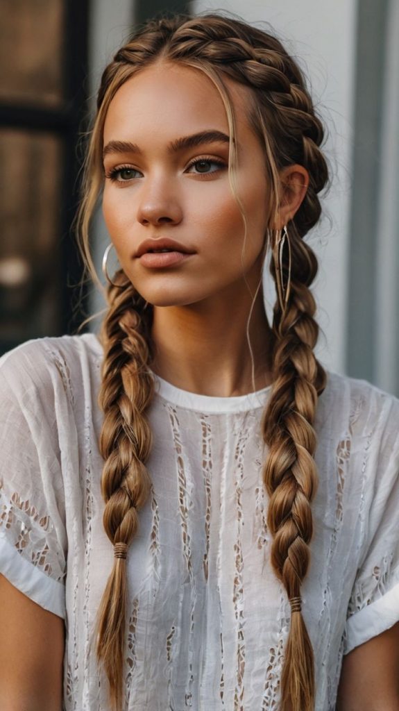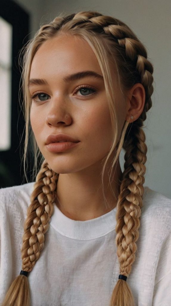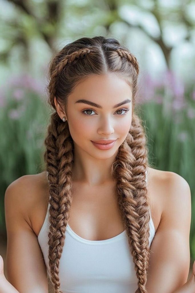 These double French braids are a fresh take on a classic style, blending structure and style for a youthful, modern appearance. Perfect for white women with long hair, this look is both functional and chic, making it ideal for workouts, casual days, or even a sporty event.