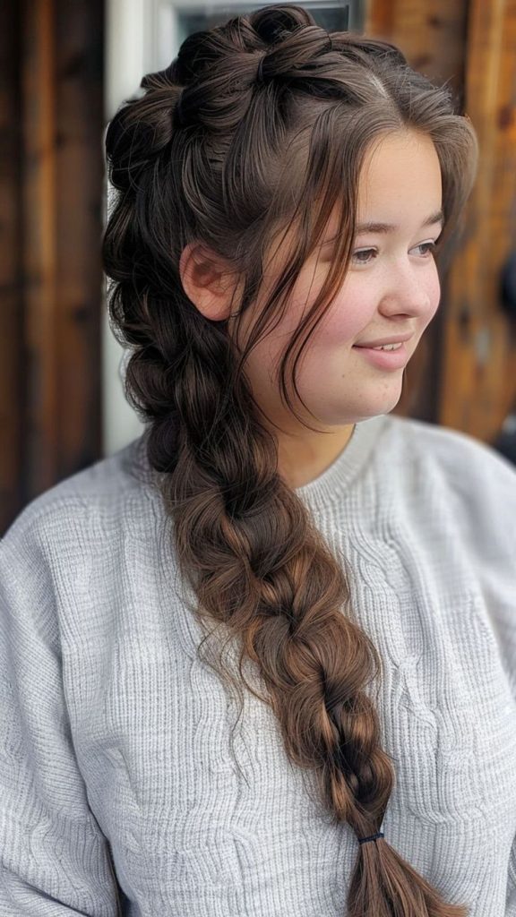 To achieve this style, use a wide-tooth comb to add volume before braiding. Start braiding from the crown, incorporating larger sections of hair. Pair this look with bold accessories to complete the ensemble.