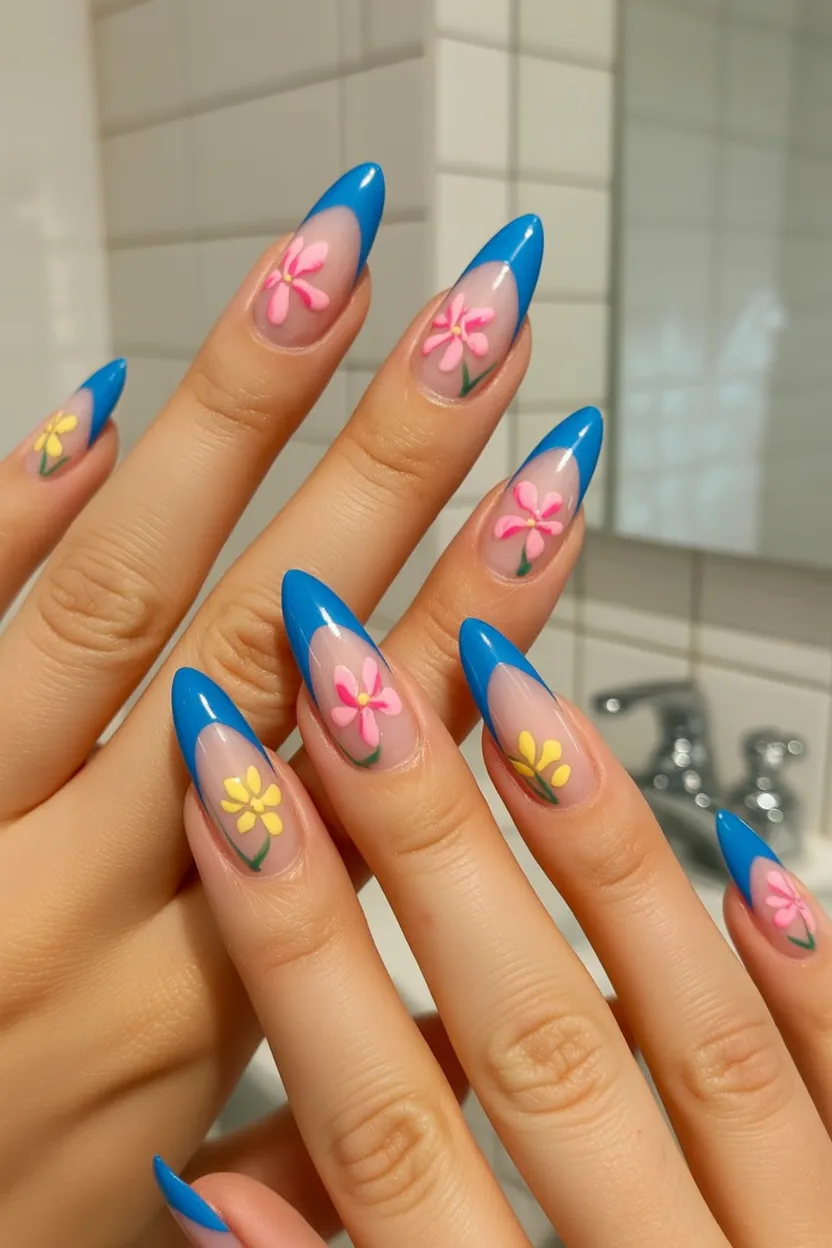 This design feels like a mini vacation on your hands. The bold blue tips paired with delicate floral art strike a beautiful balance between strong and soft. It’s eye-catching, artistic, and feels right at home in spring break nails 2026.