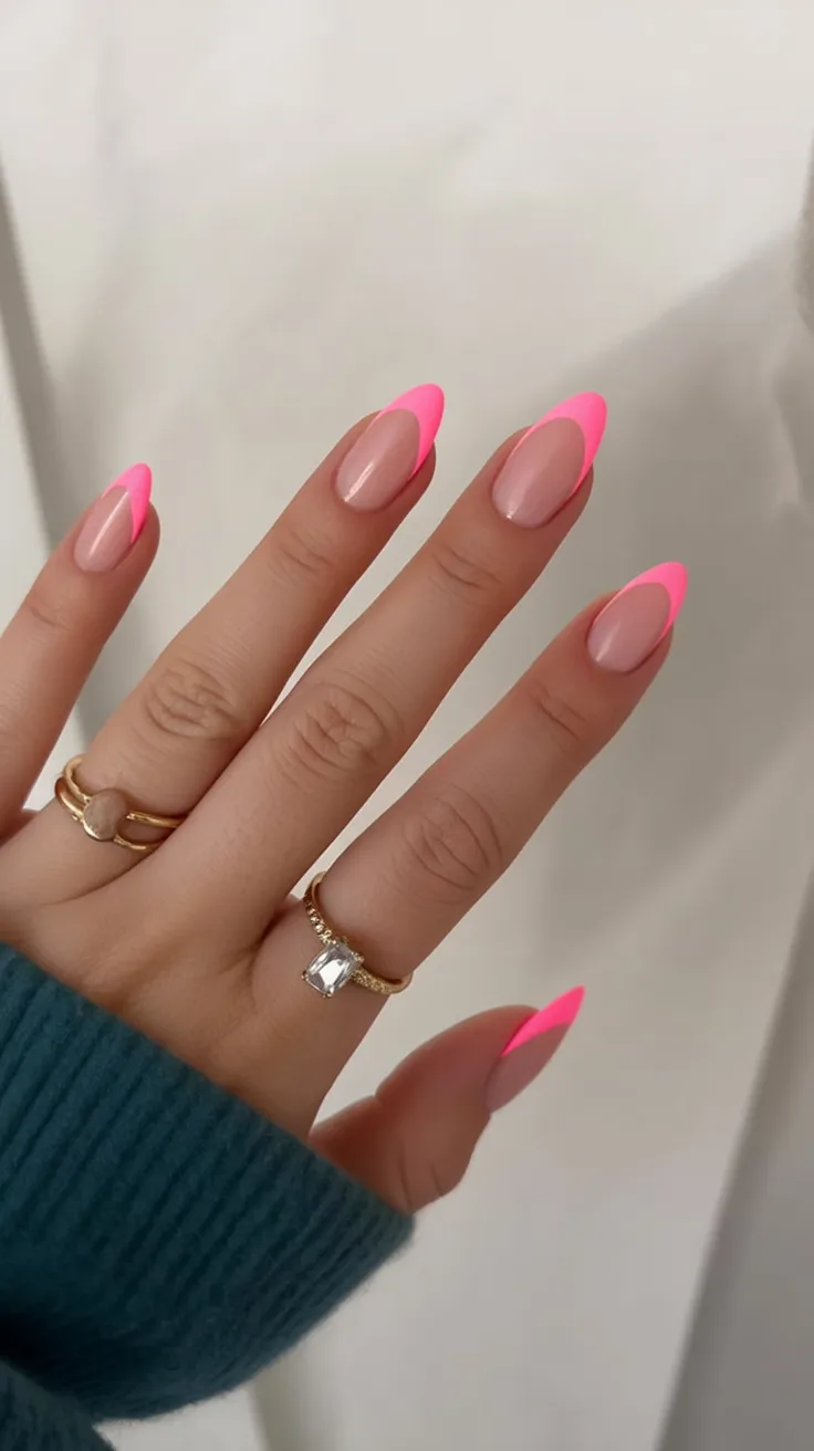 9. Neon Pink French Almond Nails