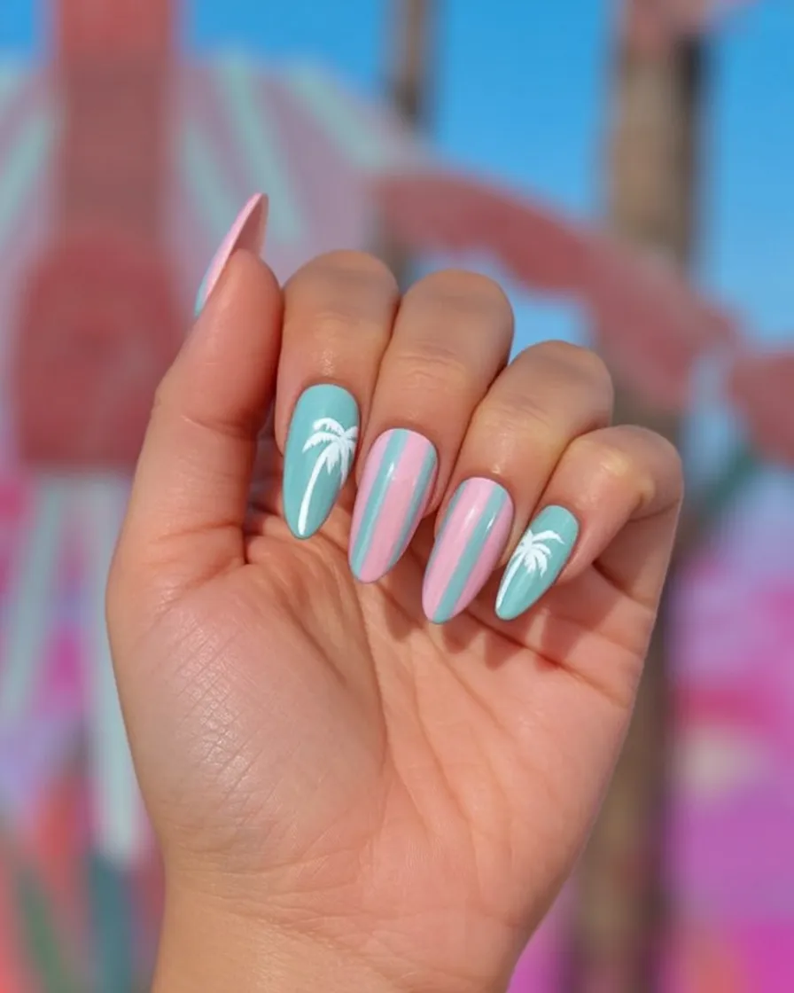 21. Pastel Palm Stripe Almond Nails