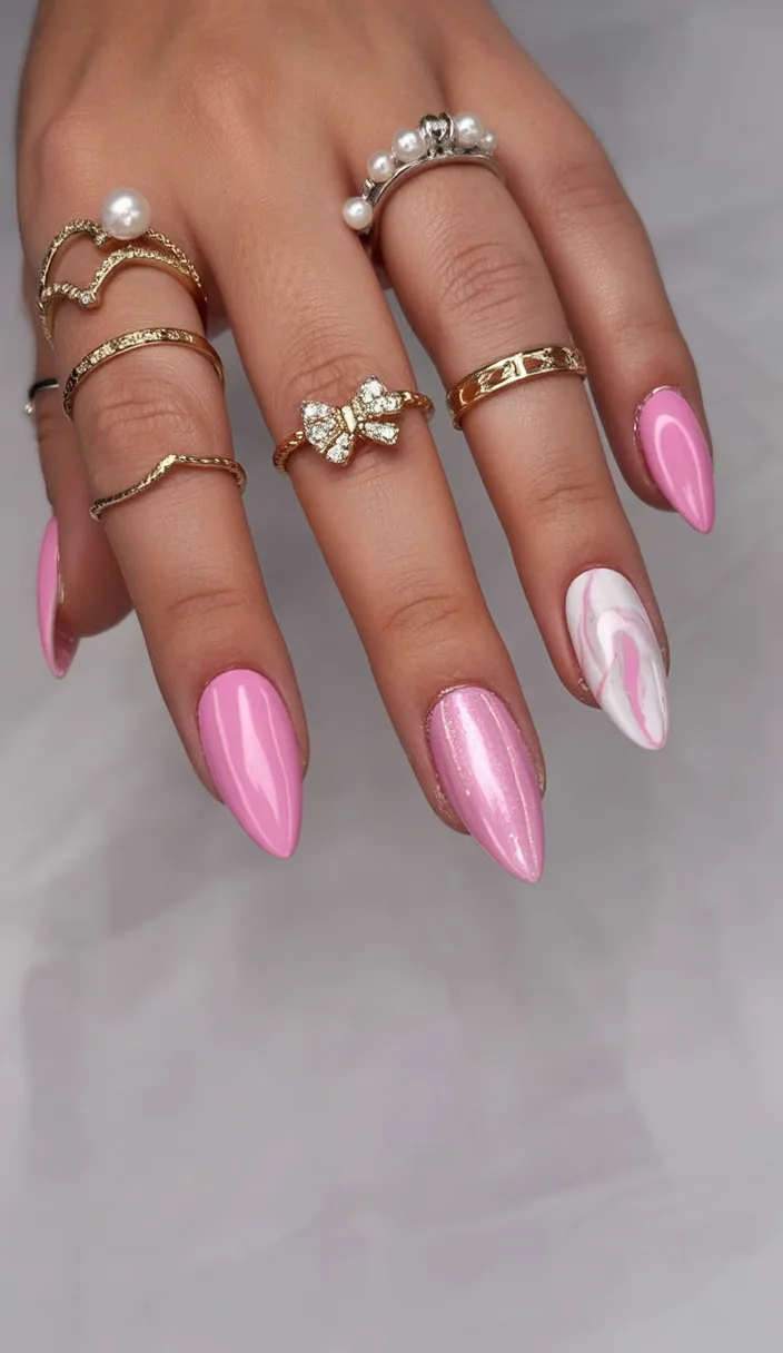 14. Glossy Pink Marble Almond Nails