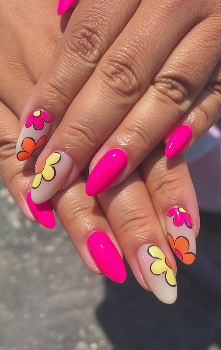 Bold, bright, and unapologetically happy—this look is spring break energy bottled up into a manicure. The pastel flowers against vibrant tips feel youthful but not childish, especially with the clean coffin shape keeping things polished. It’s the kind of set that makes you smile every time you reach for your coffee or snap a photo on vacation.