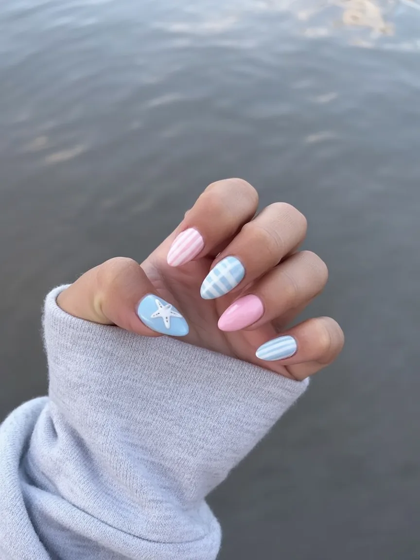 These nails practically smell like ocean air. The soft pinks and blues, gingham pattern, and starfish detail give off relaxed coastal vibes—easy, breezy, and charming. It’s a subtle nod to beach days without leaning into anything too obvious.