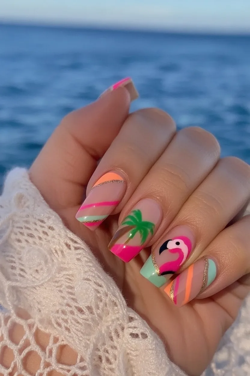19. Tropical Flamingo and Palm Coffin Nails