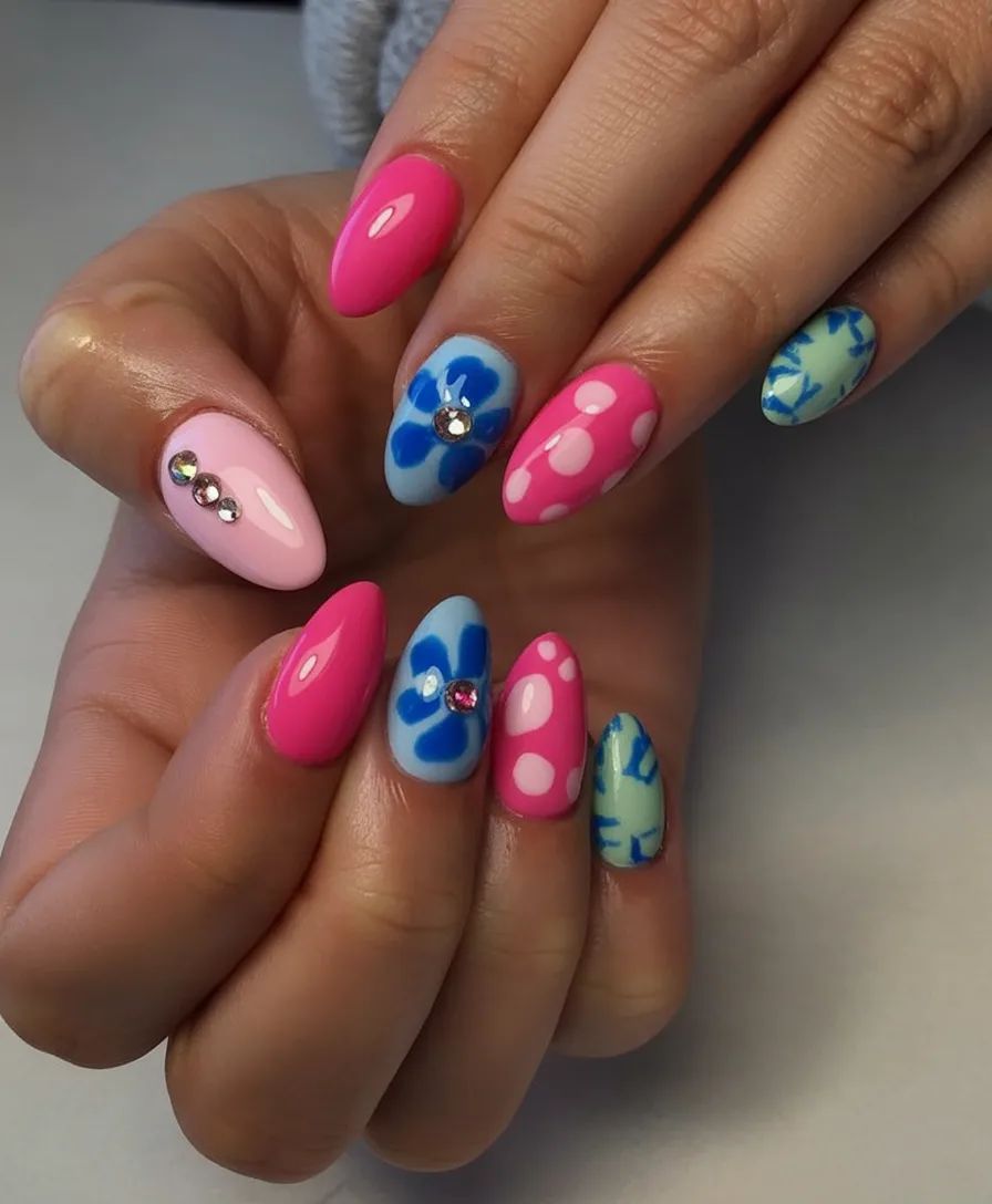 There’s a bold confidence to this look that feels perfect for spring break nails 2026. The mix of pink, blue, and floral accents gives off a carefree, almost beach-club vibe. It’s playful but polished, with just enough sparkle to catch the light without feeling over the top.