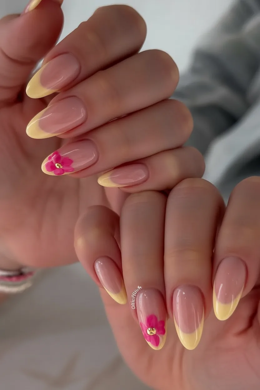 1. Soft Yellow French with Floral Accent